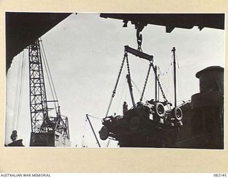 TOWNSVILLE, QLD. 1944-10-18. TRANSPORT VEHICLES OF FIRST ARMY BEING LOADED INTO THE HOLDS OF THE LIBERTY SHIP SS JAMES OLIVER FOR EMBARKATION TO LAE, NEW GUINEAAustralian War MemorialImage Papua New Guinea Online