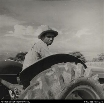 Farmer riding tractorAustralian National University LibraryImage Fiji 1950 to 2023 -