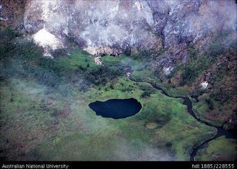 An aerial view of the main route into territories of the Febi and southern Bogaya (Muwna) people, down the face of the Muller Plateau escarpment and along the Nali (north branch of the Burnett) RiverAustralian National University LibraryImage Papua New Guinea 1980 to 2021 Online -