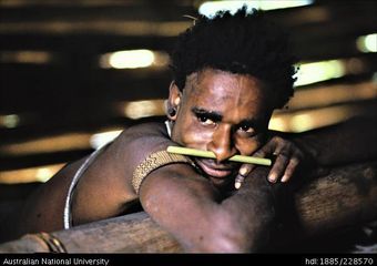 A young Febi man resting at Kuba/ Guba houseAustralian National University LibraryImage Papua New Guinea 1979 to 2021 Online -