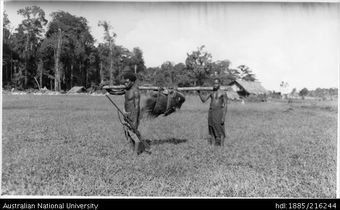 Two men, one holding a rifle, carrying a load on a pole between themAustralian National University LibraryImage Papua New Guinea 1936 to 2020 Online -
