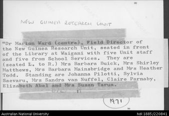 The New Guinea Research Unit with Dr Marion Ward, Barbara Buick, Mrs Shirley Matthews, Mrs Barbara Mainsbridge, Heather Todd, Johanna Pilotti, Sylvia Saevaru, Mrs Sandra van Nuffel, Claire Parnaby, Elizabeth Abel and Mrs Susan TaruaAustralian National University LibraryImage Papua New Guinea 1971 to 2021 Online