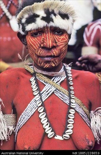 Elaborately dressed Febi drummers with intricate designs painted on their bodies prepare to participate in the end-of-year cultural activities at Koroba Provincial High SchoolAustralian National University LibraryImage Papua New Guinea 1980 to 2021 Online -
