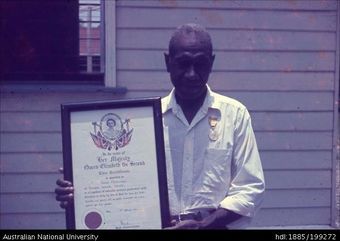 Chief Molirani holding certificate awarded for 26 years of serviceAustralian National University LibraryImage Vanuatu 1960 to 2020 Online -