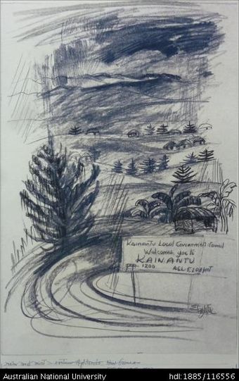 rain and mist - Eastern Highlands, New Guinea [with road sign “ . . . Kainantu”]Australian National University LibraryImage Papua New Guinea 1970 to 2017 Online -