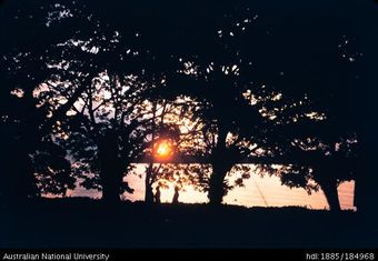 Sunset over water, seen through foliageAustralian National University LibraryImage Papua New Guinea 1950 to 2019 Online -