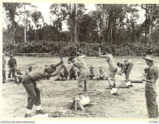 TOROKINA, BOUGAINVILLE ISLAND. 1945-01-01. PERSONNEL OF THE 61ST INFANTRY BATTALION COMPETING IN THE FINAL OF THE WOOD CHOP EVENT AT THE ATHLETIC MEETING ORGANISED BY HEADQUARTERS, 3RD DIVISION. ..Australian War MemorialImage Papua New Guinea Online