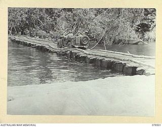 BOUGAINVILLE ISLAND, 1945-01-19. AN AUSTRALIAN ARMY JEEP CROSSING THE OLD FBE BRIDGE ACROSS THE REINI RIVER WHICH IS TO BE REPLACED BY A NEW PERMANENT BRIDGE TO BE BUILT BY THE 5TH FIELD COMPANYAustralian War MemorialImage Papua New Guinea Online