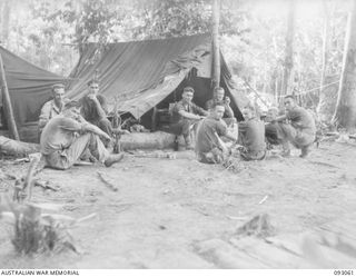 WEWAK AREA, NEW GUINEA, 1945-06-11. A GROUP OF 2/8 INFANTRY BATTALION SIGNALLERS TAKEN OUTSIDE THE SIGNAL OFFICE ON 770 FOOT FEATURE. IDENTIFIED PERSONNEL ARE:- PTE A.S. COOK (1); PTE L. LANE (2); ..Australian War MemorialImage Papua New Guinea Online