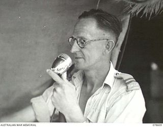 PALMALMAL PLANTATION, NEW BRITAIN. 1945-01-22. B5/29 REPRESENTATIVE K. WATTS, YOUNG MEN'S CHRISTIAN ASSOCIATION SPEAKING TO THE TROOPS OVER THE PUBLIC ADDRESS SYSTEM AT THE 5TH BASE SUB AREAAustralian War MemorialImage Papua New Guinea Online