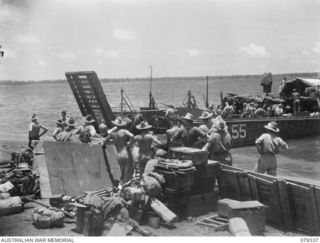 BOUGAINVILLE ISLAND. 1945-03-05. TROOPS OF THE 7TH INFANTRY BRIGADE LOADING STORES AND SUPPLIES ON TO BARGES AT MAWARAKA DURING THE UNIT HEADQUARTERS MOVE FROM HOZAN TO TOKOAustralian War MemorialImage Papua New Guinea Online