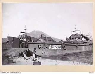 MALAGUNA, NEW BRITAIN. 1945-09-20. LANDING CRAFT, VEHICLES AT THE BEACH, ASSISTING IN THE UNLOADING OF SHIPS IN SIMPSON HARBOUR. FOLLOWING THE SURRENDER OF THE JAPANESE. AUSTRALIAN TROOPS NOW ..Australian War MemorialImage Papua New Guinea Online