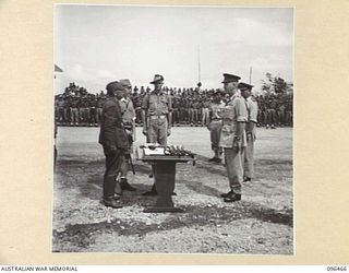 CAPE WOM, NEW GUINEA, 1945-09-13. MAJOR-GENERAL H.C.H. ROBERTSON, GENERAL OFFICER COMMANDING 6 DIVISION, ADDRESSING TROOPS OF 6 DIVISION, DURING THE SURRENDER CEREMONY HELD AT CAPE WOM AIRSTRIP. ..Australian War MemorialImage Papua New Guinea Online