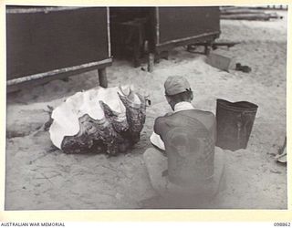 FAURO ISLAND, BOUGAINVILLE AREA. 1945-11-12. AN UNUSUAL TATTOO DESIGN ON THE BACK OF A JAPANESE SOLDIER WORKING ON THE ISLAND. A GIANT CLAM IN BACKGROUND. JAPANESE ARMY AND NAVAL TROOPS ARE ..Australian War MemorialImage Papua New Guinea Online