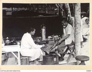 PIEDU ISLAND, SOLOMON ISLANDS. 1945-11-13. A MEDICAL ORDERLY DRESSING A LEG WOUND AT THE OUTSIDE REGIMENTAL AID POST. JAPANESE CONCENTRATED ON THE ISLAND ARE UNDER THE CONTROL OF 7 INFANTRY ..Australian War MemorialImage Online