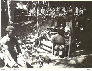 OIVA RIVER, NEW BRITAIN. 1945-02-07. NATIVE TROOPS OF B COMPANY, 1ST NEW GUINEA INFANTRY BATTALION PREPARING A MEAL IN THE UNIT KITCHENAustralian War MemorialImage Papua New Guinea Online