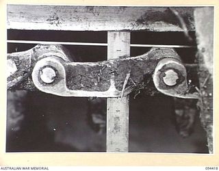 TOROKINA AREA, BOUGAINVILLE. 1945-07-28. CAPTAIN ROWLEY EXAMINING THE TRACKS OF AN M24 GENERAL CHAFFEE LIGHT TANK WHICH WERE CLEANED BEFORE THE TRIALS FOR TESTS TO BE CONDUCTED FOR THE WAR OFFICEAustralian War MemorialImage Papua New Guinea Online