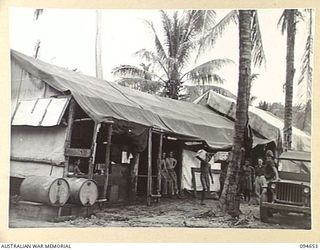 TOL AREA, NEW BRITAIN. 1945-08-01. THE CANTEEN ISSUE POINT NO. 3 JB, AUSTRALIAN ARMY CANTEEN SERVICE, WHICH WAS THE FIRST ARMY BUILDING ERECTED IN THE TOL AREA. IT IS ATTACHED TO 13 INFANTRY ..Australian War MemorialImage Papua New Guinea Online