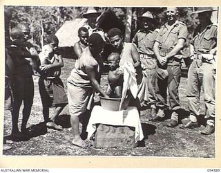SIPILANGAN, NEW BRITAIN, 1945-07-27. TWO REFUGEE NATIVES BATHING A PICCANINNY AT THE AUSTRALIAN NEW GUINEA ADMINISTRATIVE UNIT REFUGEE CAMP IN THE WIDE BAY AREA. AUSTRALIAN ARMY SERVICE CORPS ..Australian War MemorialImage Papua New Guinea Online