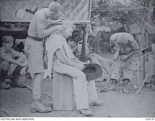 PAPUA. 1942-09. AN AUSTRALIAN INFANTRYMAN GETS HIS HAIR CUT AFTER BEING IN A FORWARD JUNGLE POSITION IN THE OWEN STANLEY RANGES FOR TWO WEEKSAustralian War MemorialImage Papua New Guinea Online
