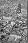 Returned laborers, purification ritual: child adds greens to food display, including several pigletsUC San Diego, Special Collections and ArchivesImage Papua New Guinea
