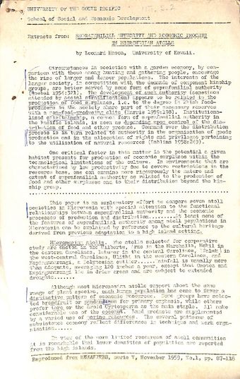 Extracts from 'Suprafamilial authority and economic process in micronesian atolls' by Leonard Mason, University of HawaiiTe Puna Vai Marama Cook Islands Centre for ResearchText Cook Islands Online -