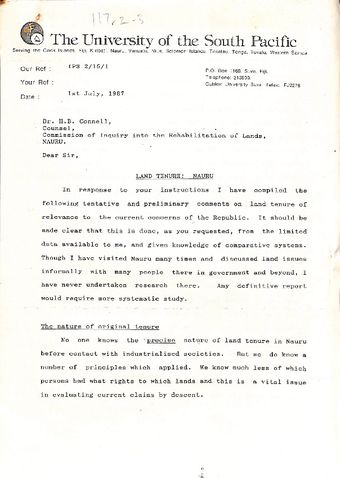 Letter to H. B. Counsell, Commission of Enquiry into the Rehabilitation of Lands, NauruTe Puna Vai Marama Cook Islands Centre for ResearchText Cook Islands Online -