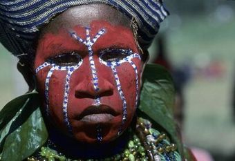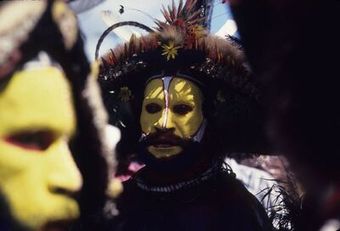 ["ansiktsmålade, musiker, peruker, fotografi, photograph"]Museum of EthnographyType Unknown Papua New Guinea -