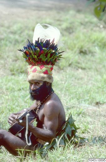 ["gitarr, porträtt, skägg, man, huvudbonad, fotografi, photograph"]Museum of EthnographyType Unknown Papua New Guinea -