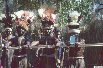 ["ansiktsmålning, musiker, porträtt, huvudbonad, män, fotografi, photograph"]Museum of EthnographyType Unknown Papua New Guinea