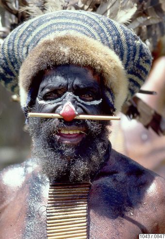 ["man, porträtt, huvudbonad, ansiktsmålning, halsband, fotografi, photograph"]Museum of EthnographyType Unknown Papua New Guinea -