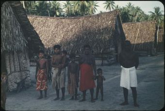 Man with women and children stading in front of village houses : Tasman Islands, Papua New Guinea, 1960 / Terence and Margaret SpencerNational Library of AustraliaImage Papua New Guinea 1953 to 1978