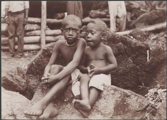 Two boys sitting on landing rocks of Merelava, Banks Islands, 1906 / J.W. BeattieNational Library of AustraliaImage Vanuatu Online