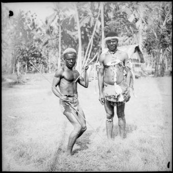 Two men, one in a spear throwing pose, Awar, New Guinea, 1935 / Sarah ChinneryNational Library of AustraliaImage Papua New Guinea Online