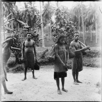 Five Papuan dancers, three men with hand drums and two women, Papua, ca. 1923 / Sarah ChinneryNational Library of AustraliaImage Papua New Guinea 1921 to 1924 Online