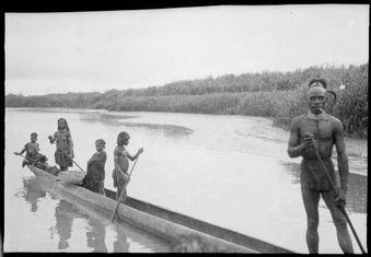 Four women in the stern of a canoe paddling and one man standing in the bow of the canoe, Ramu River, New Guinea, 1935 / Sarah ChinneryNational Library of AustraliaImage Papua New Guinea Online