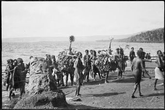 Two Dukduks and a crowd of people on a beach, Rabaul Harbour, New Guinea, ca. 1929 / Sarah ChinneryNational Library of AustraliaImage Papua New Guinea 1924 to 1937