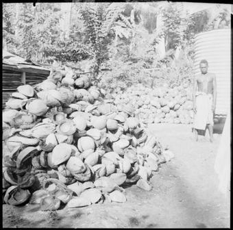 Man standing in front of a water tank with piles of coconuts, New Guinea, ca. 1936 / Sarah ChinneryNational Library of AustraliaImage Papua New Guinea 1935 to 1937