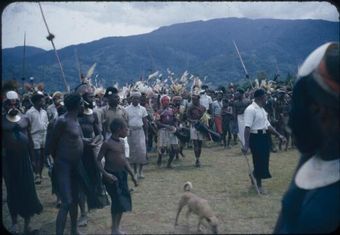 New Year's Day festivities at Minj Station, 1955, coastal and highland dancers in the dance square, a lonely dog accompanies them : Minj Station, Wahgi Valley, Papua New Guinea, 1954 / Terence and Margaret SpencerNational Library of AustraliaImage Papua New Guinea 1953 to 1978