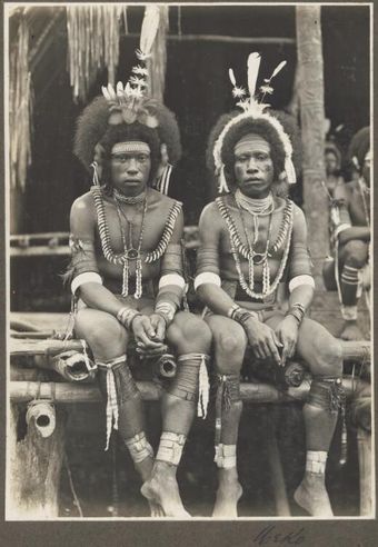 Mekeo [two men sitting side by side on a bamboo structure] Frank HurleyNational Library of AustraliaImage Papua New Guinea Online