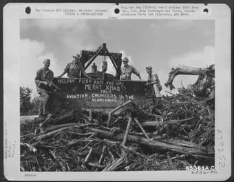 Aviation Engineers Who Are Clearing Debris From Area On Saipan, Marianas Islands, Pause Long Enough To Wish The Folks At Home A 'Merry Christmas'. They Are, Left Ot Right: T/4 Charles Fischer, Pfc. William K. Visner, T/5 Dale Peterson, And Cpl. Angelo Del (U.S. Air Force Number 65361AC)National Archives at College Park - Still PicturesImage