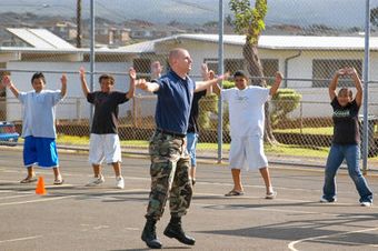 US Navy (USN) Electrician's Mate Second Class (EM2) Jason Switzer, assigned to Mobile Diving Salvage Unit 1 (MDSU-1) leads children through warm-up exercises during a Community Relations (COMREL) visit at Waipahu Elementary School, Hawaii (HI)National Archives at College Park - Still PicturesImage Hawaiʻi