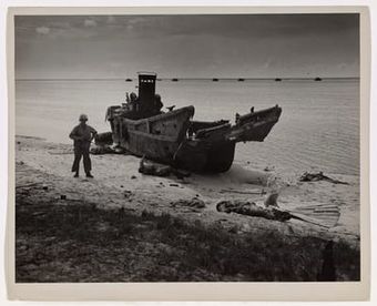 Photograph of a U.S. Marine Standing By a Wrecked Japanese Landing BargeNational Archives at College Park - Still PicturesImage