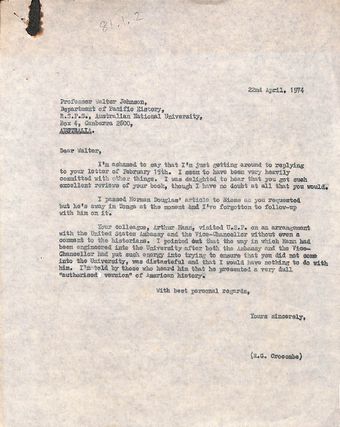 Correspondence between Ron Crocombe and Walter Johnson (Australian National University)Te Puna Vai Marama Cook Islands Centre for ResearchText Cook Islands Online -