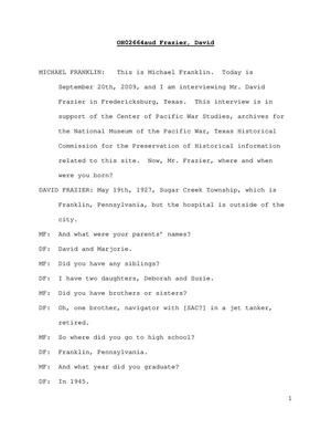 Oral History Interview with David Frazier, September 20, 2009National Museum of the Pacific War/Admiral Nimitz FoundationText