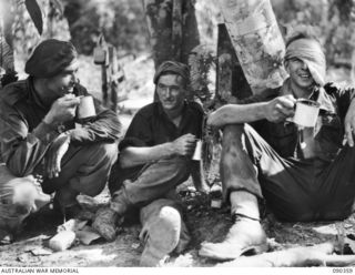 BOUGAINVILLE. 1945-04-05. 25 INFANTRY BATTALION TROOPS SIPPING A BREW AFTER THE MAIN ATTACK IN THE SLATER'S KNOLL LOCALITY HAD ENDED AND WHILE MOPPING UP OPERATIONS WERE CONTINUING. CPL C.R. HOCKEY ..Australian War MemorialImage Papua New Guinea Online