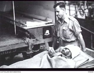 NEW GUINEA. 1943-07-28. A WOUNDED MEMBER OF THE 1ST PAPUAN INFANTRY BATTALION BROUGHT TO ORO BAY BY THE TUNGSIN (AN AMERICAN CHARTERED VESSEL) BEING PLACED IN AN AMBULANCE. SHOWN IS DRIVER K. ..Australian War MemorialImage Papua New Guinea Online