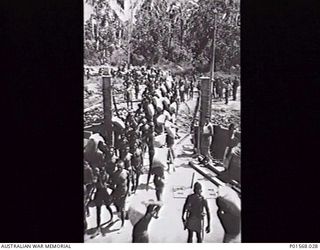 BOGIA, NEW GUINEA. 1944-08. STERN OF AB422 FRANCES PEAT WITH THE RAMP DOWN, AT THE LANDING AT BOGIA. COMING ON BOARD ARE A COMPANY OF THE NEW GUINEA INFANTRY BATTALION AND THEIR CARRIERS. THE ..Australian War MemorialImage Papua New Guinea Online