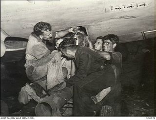 VIVIGANI, GOODENOUGH ISLAND, PAPUA. 1943-11-02. RAAF KITTYHAWK PILOTS ARE FLYING THEIR SINGLE ENGINE AIRCRAFT OVER MILES OF SEA TO DIVE BOMB NEW BRITAIN. THESE ARMOURERS WORKED THROUGH THE NIGHT TO ..Australian War MemorialImage Papua New Guinea Online