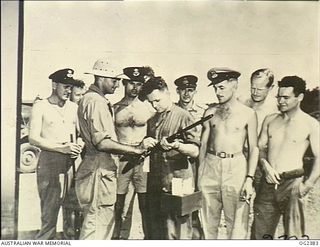 RED BEACH, MOROTAI ISLAND, HALMAHERA ISLANDS, NETHERLANDS EAST INDIES. 1945-04-23. ENGINEERS OF NO. 61 AIRFIELD CONSTRUCTION WING RAAF WHO TOOK PART IN THE TARAKAN OPERATIONS SAY FAREWELL TO ..Australian War MemorialImage Papua New Guinea Online